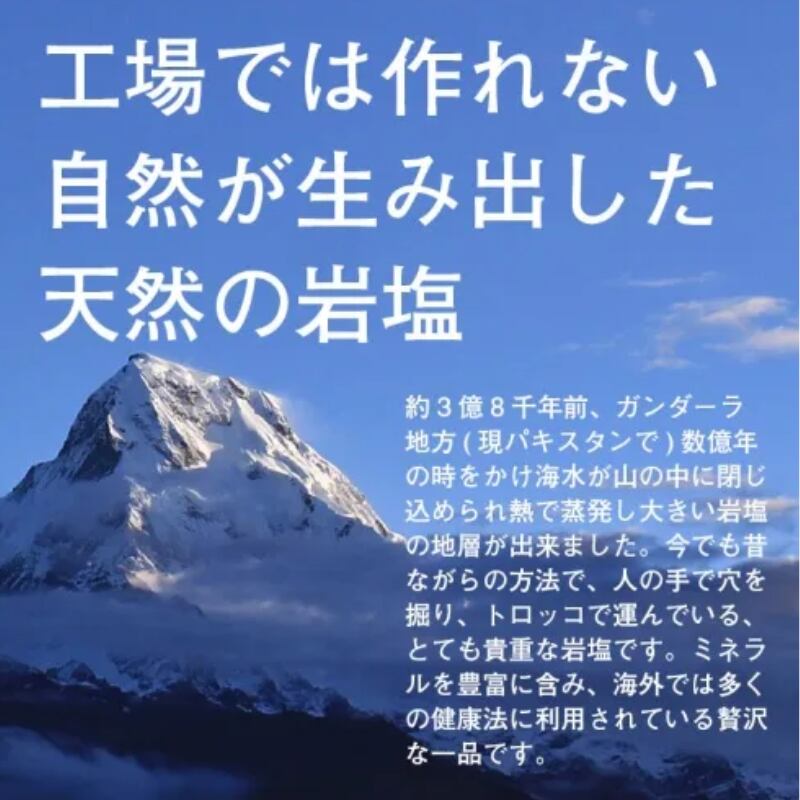 数ある産地の中でも パキスタンの岩塩は、標高世界2位〜8位の山々がつらなって いるため、バランスのいいミネラル豊富な成分が含まれています。